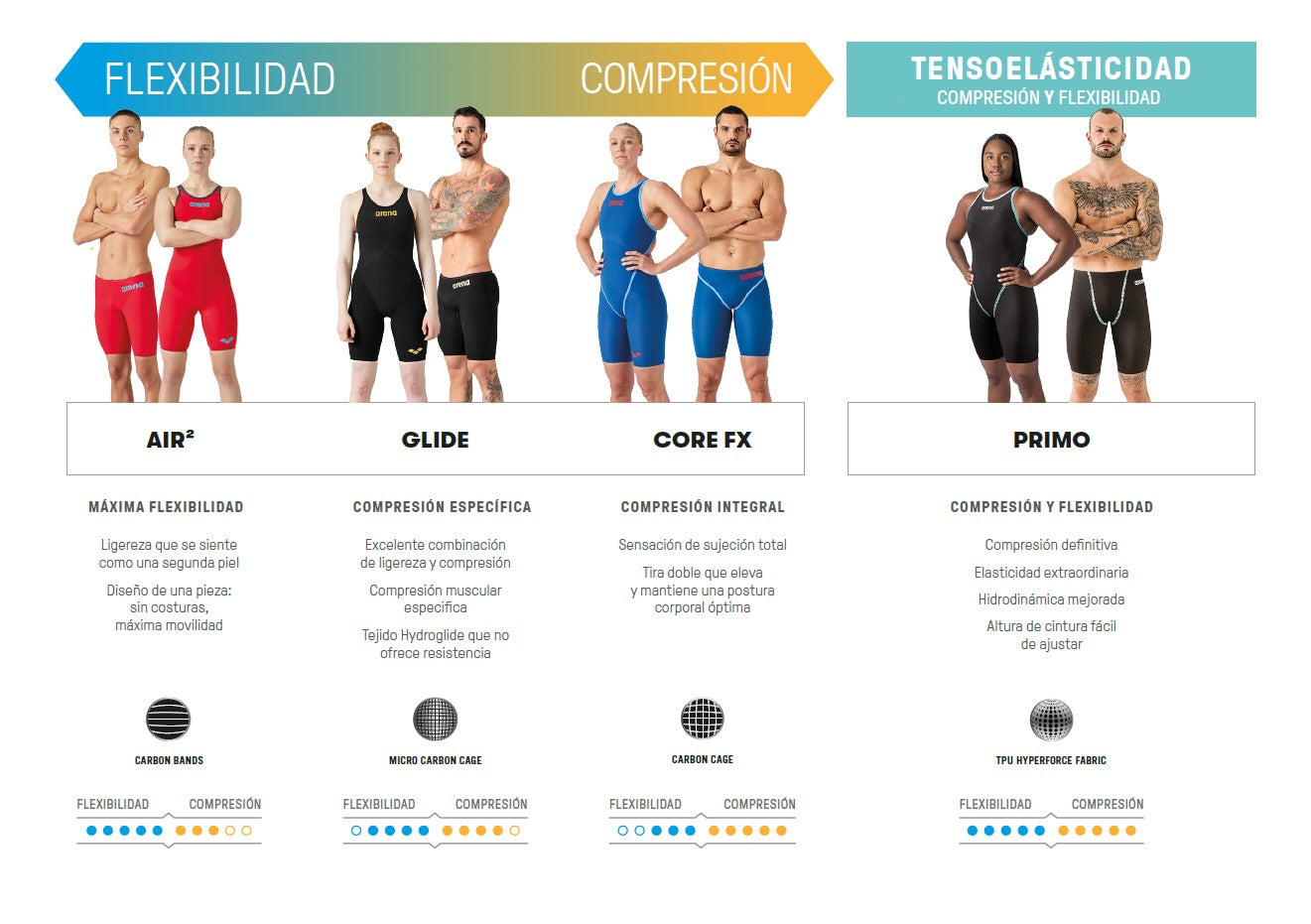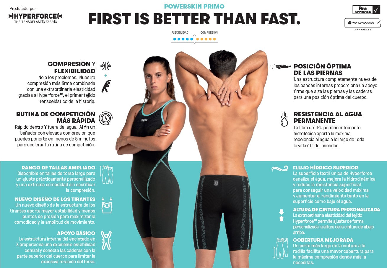 Después de 4 años de desarrollo, 18 meses de pruebas, 89 prototipos diferentes y casi 400 atletas involucrados, finalmente podemos presentar lo último en tecnología de trajes de competición: Powerskin Primo, diseñado para proporcionar todo lo que un nadador necesita en un traje: la más alta compresión en toda la prenda, Máximo confort e hidrodinámica superior.