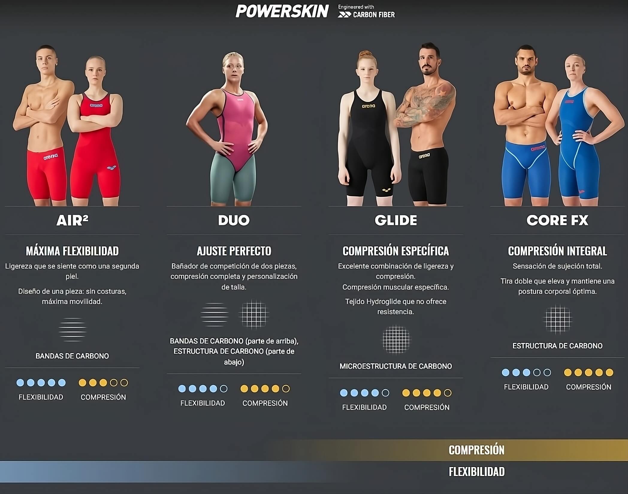 Después de años de trabajo, el equipo de investigación y desarrollo de arena ha diseñado un sistema revolucionario para incorporar hilos flexibles de este material en el tejido de todos los bañadores de competición Carbon Series, procurando un rendimiento único sin sacrificar la flexibilidad y el rango de movimiento.